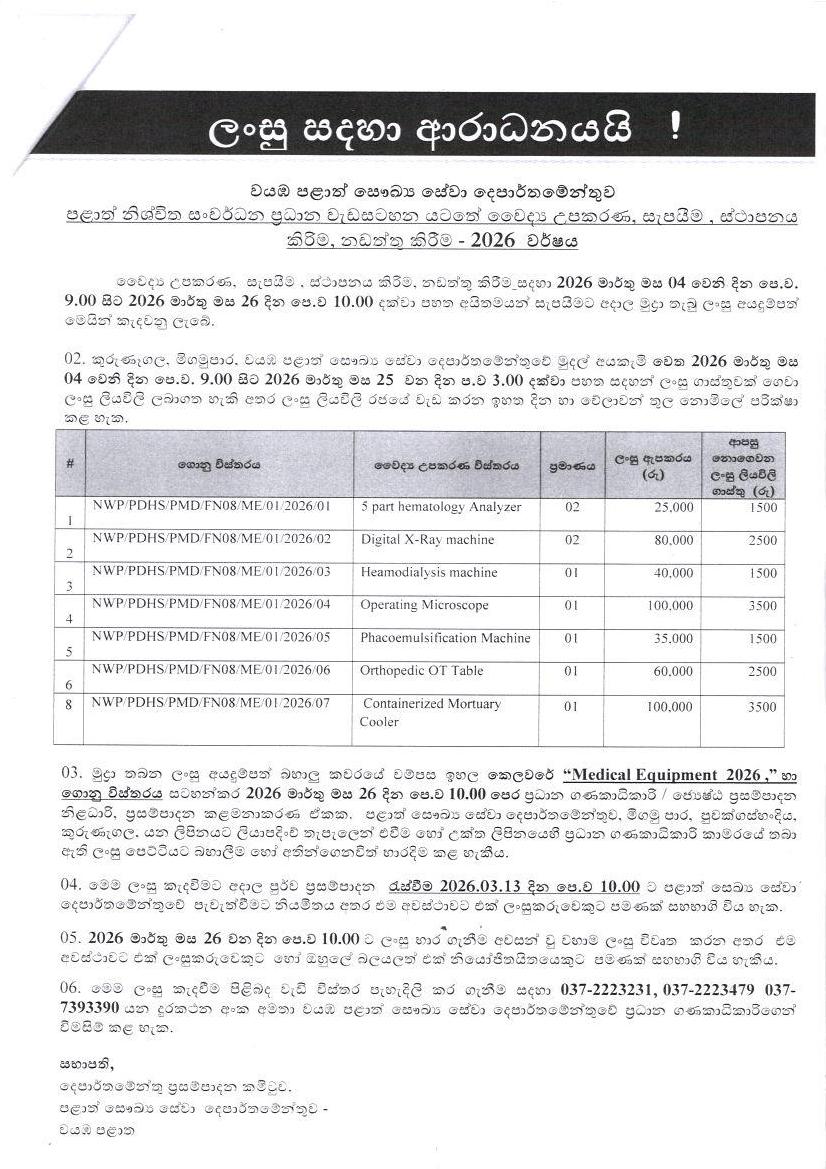 PSDG යටතේ වෛද්ය උපකරණ සැපයීම, ස්ථාපනය කිරීම සහ නඩත්තු කිරීම සඳහා ලංසු කැඳවීම - 2026 |